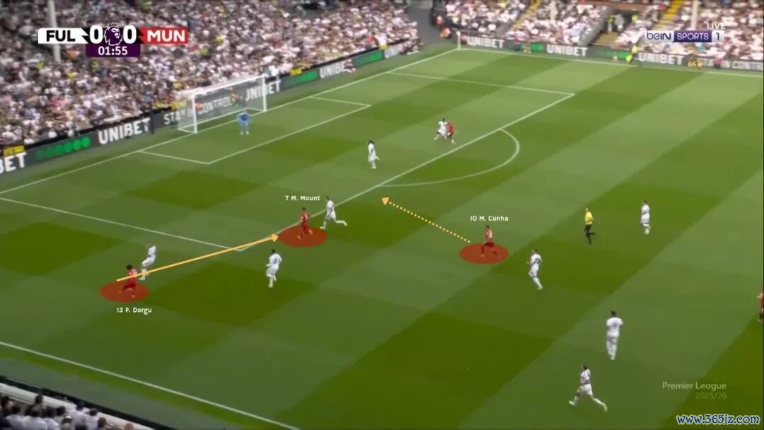 曼联与富勒姆的赛事 ,芒特在左路与多古进行撞墙式协作 后,危险区域 边缘接应直接过渡给库尼亚,后者射球 中柱,就是这一作用的经典案例。
